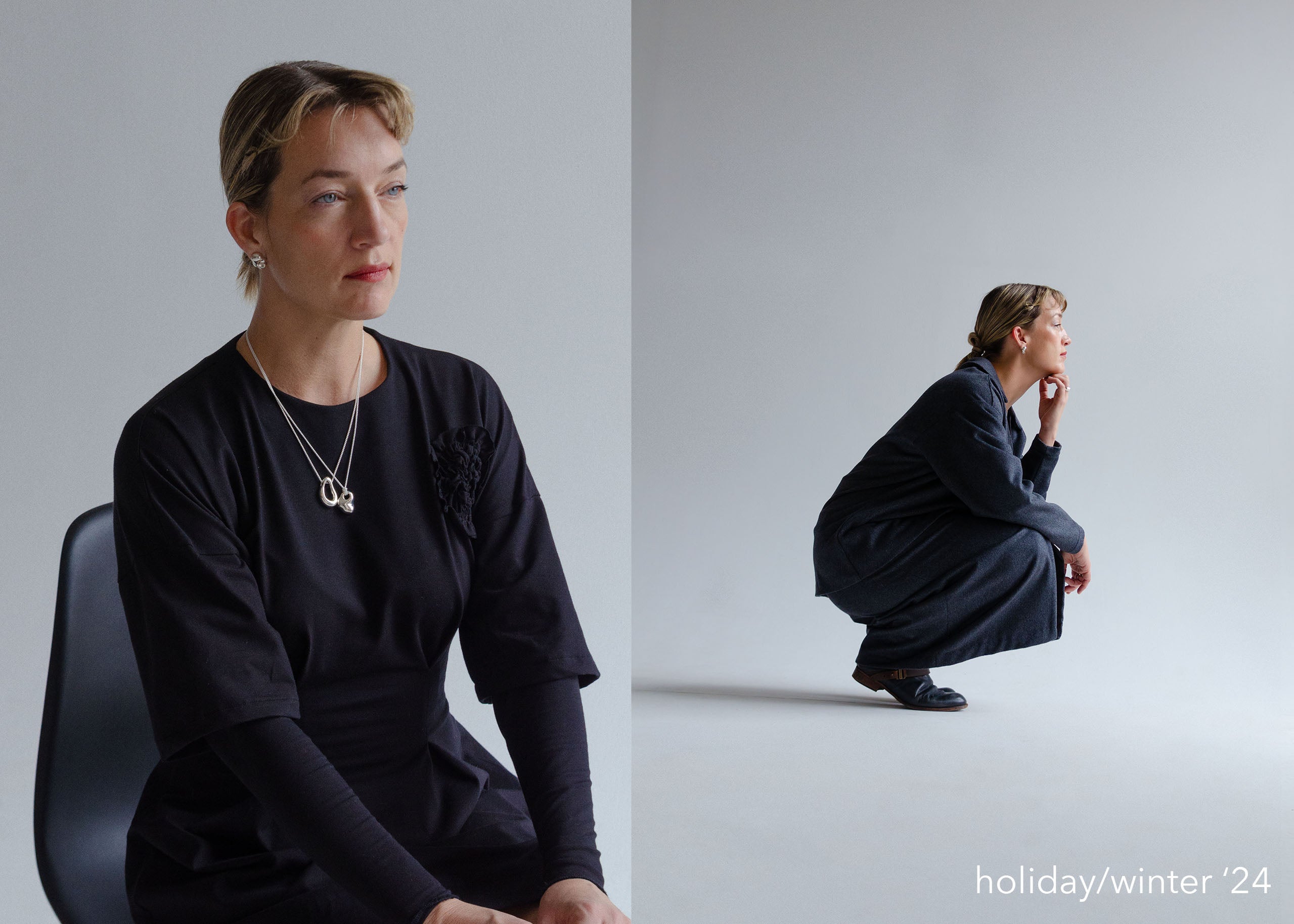 As usual, every design is a testament to slow fashion. From the thoughtfully tailored silhouettes to subtle, unexpected details like subtle fabric manipulation & bold silhouettes, our pieces invite you to experience clothing as more than just something you wear. Paired with Cat’s modern, organic jewelry forms, this collaboration shines a spotlight on craftsmanship, individuality, and timeless style.