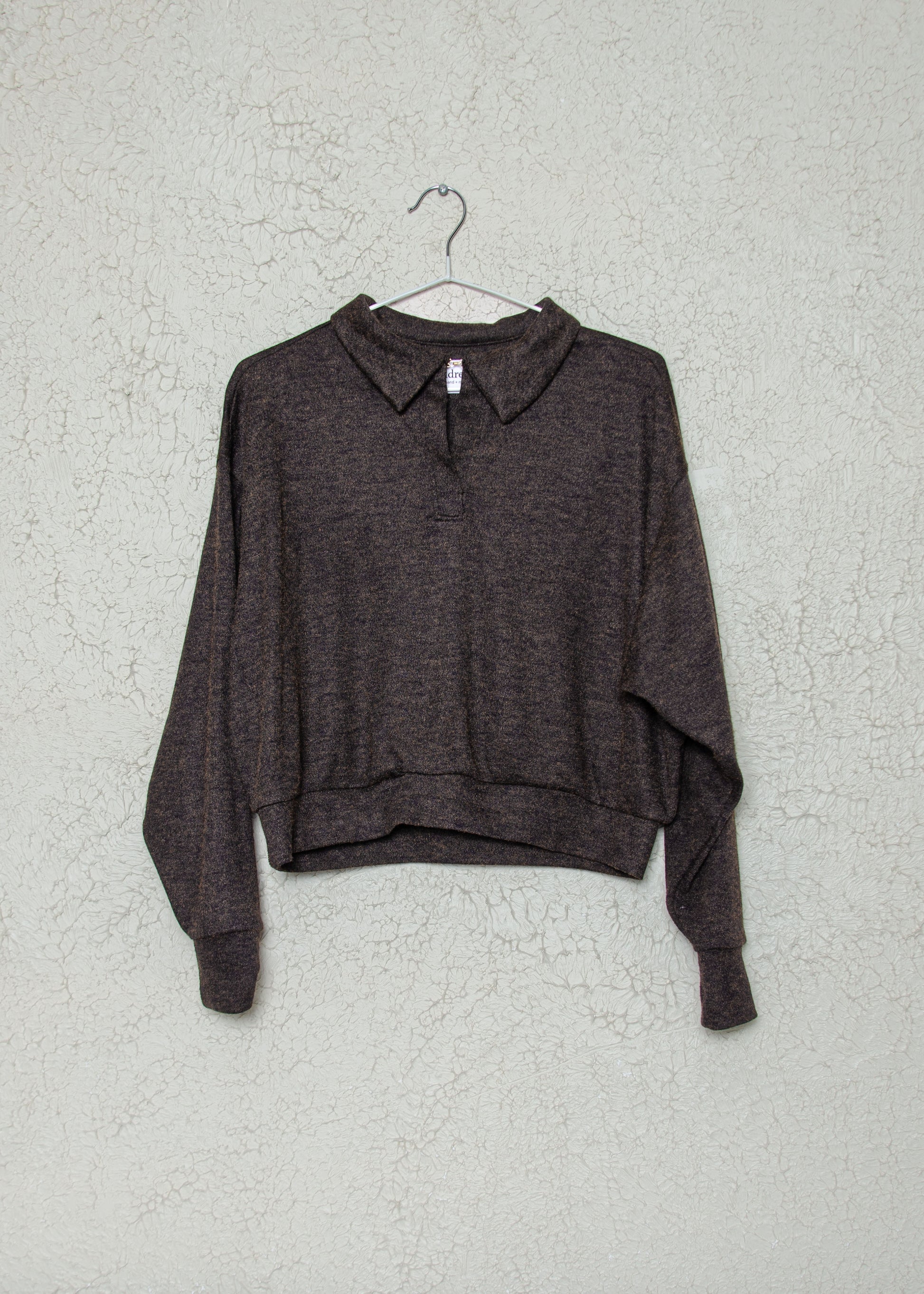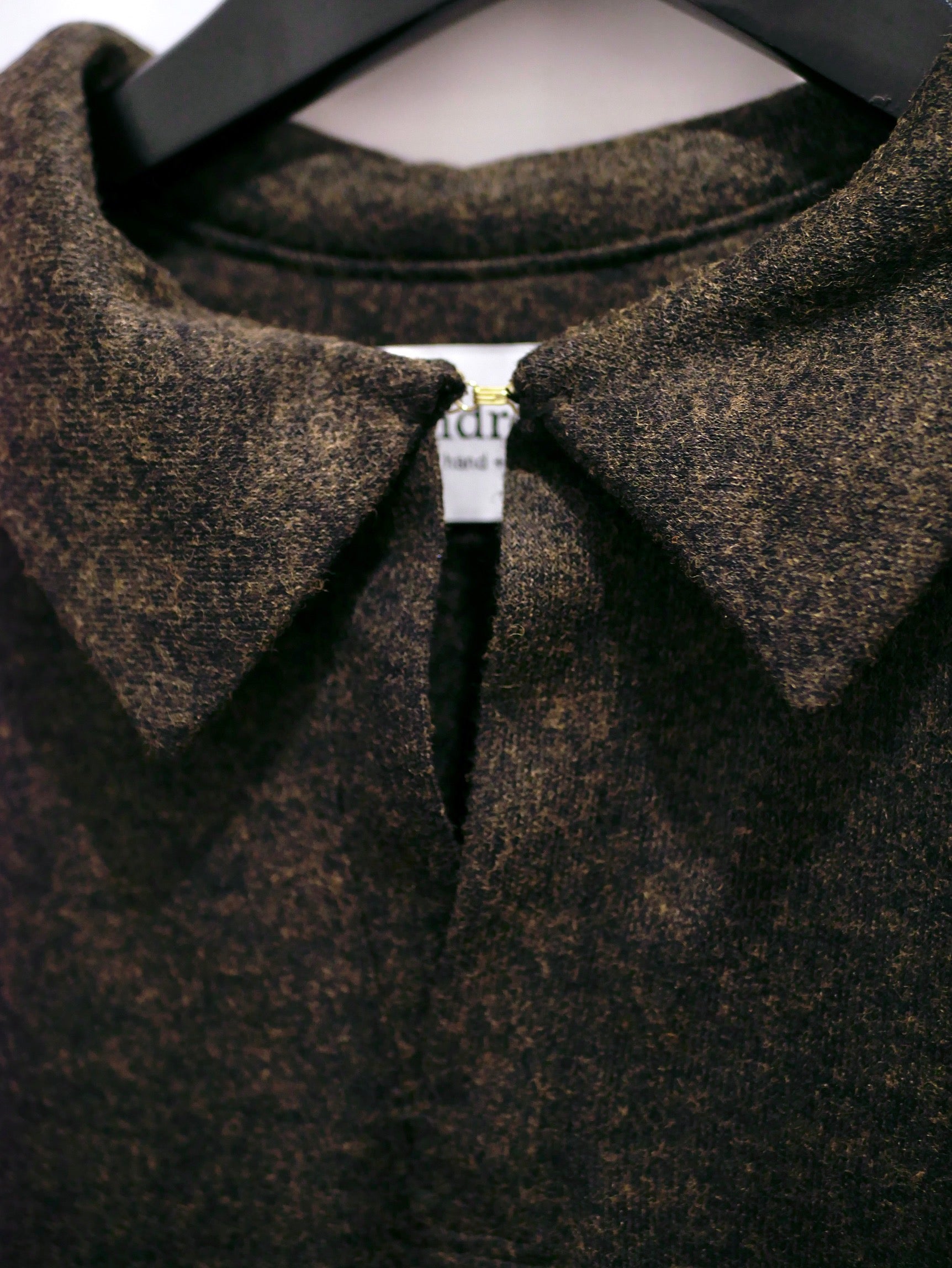 Cropped knit top with dropped sleeves, collar and placket & hidden elastic bottom band. Gold hook & eye closure at neckline. Made from a soft wool blend knit fabric.