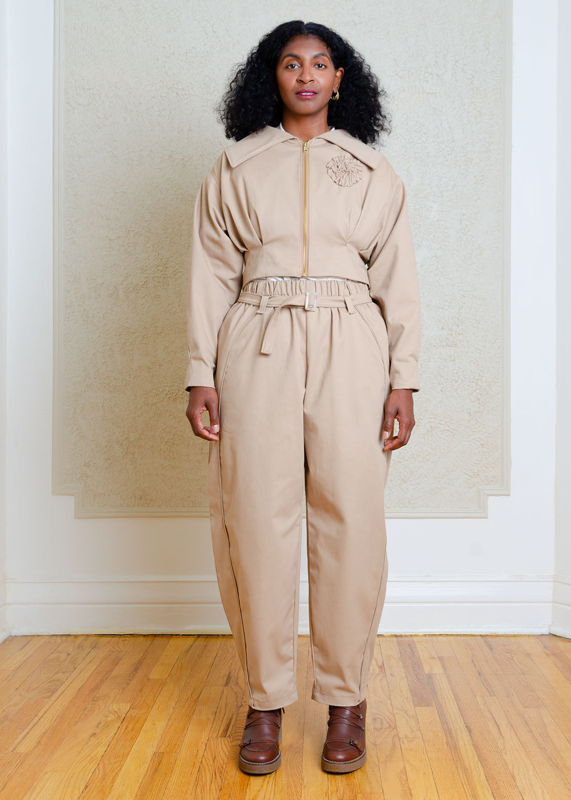 High waisted barrel pants with removable contrast belt, belt loops, elasticized waist, in-seam trim, large side seam pockets & back patch pockets.