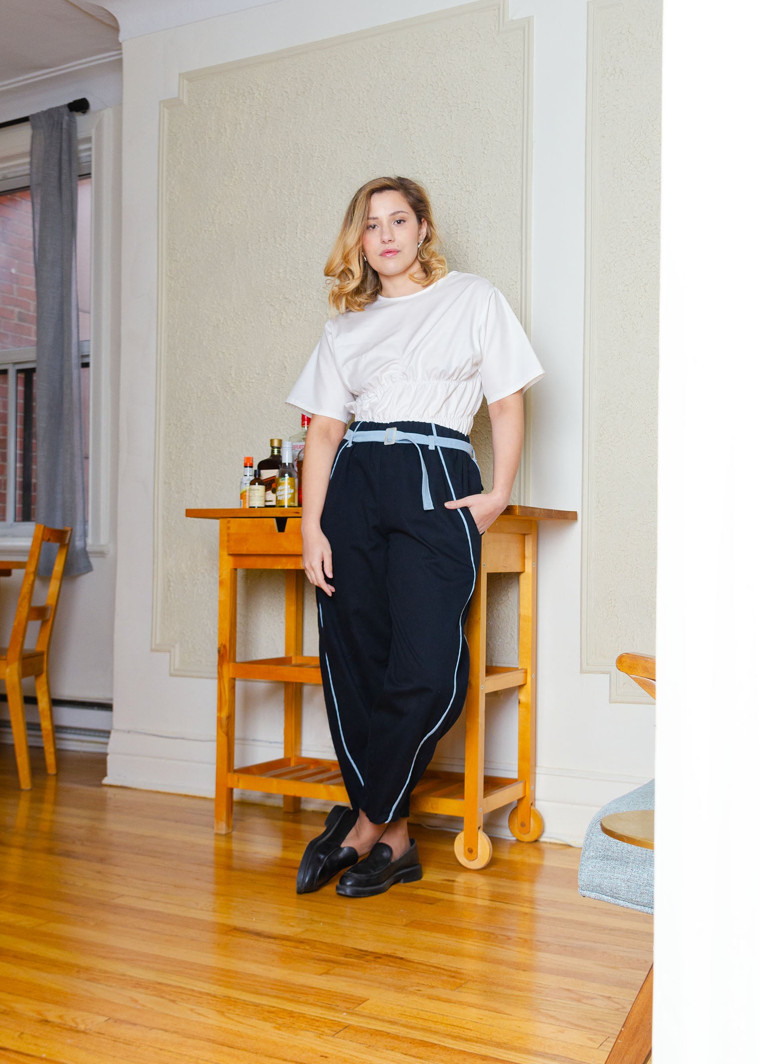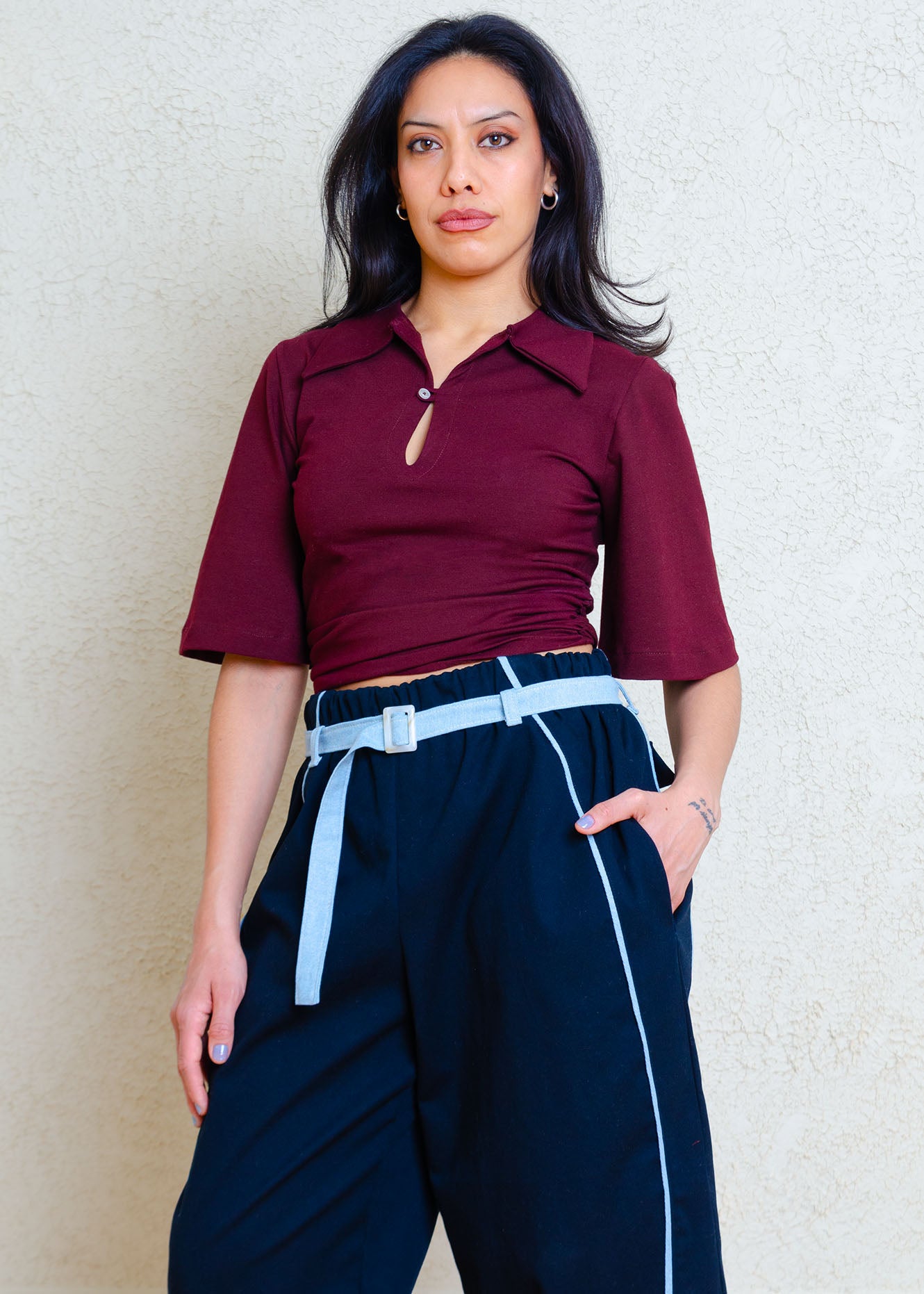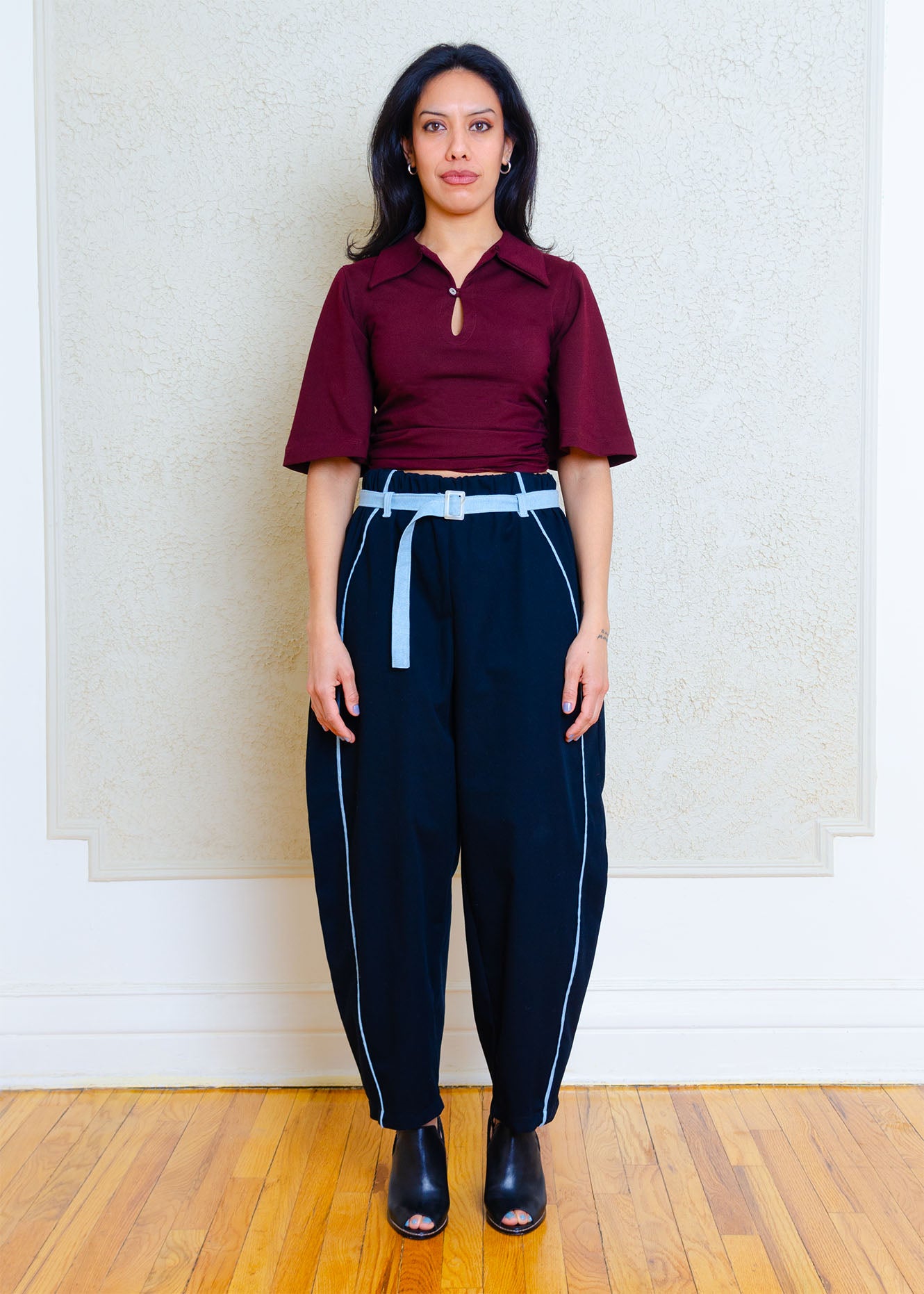 High waisted barrel pants with removable contrast belt, belt loops, elasticized waist, in-seam trim, large side seam pockets & back patch pockets.