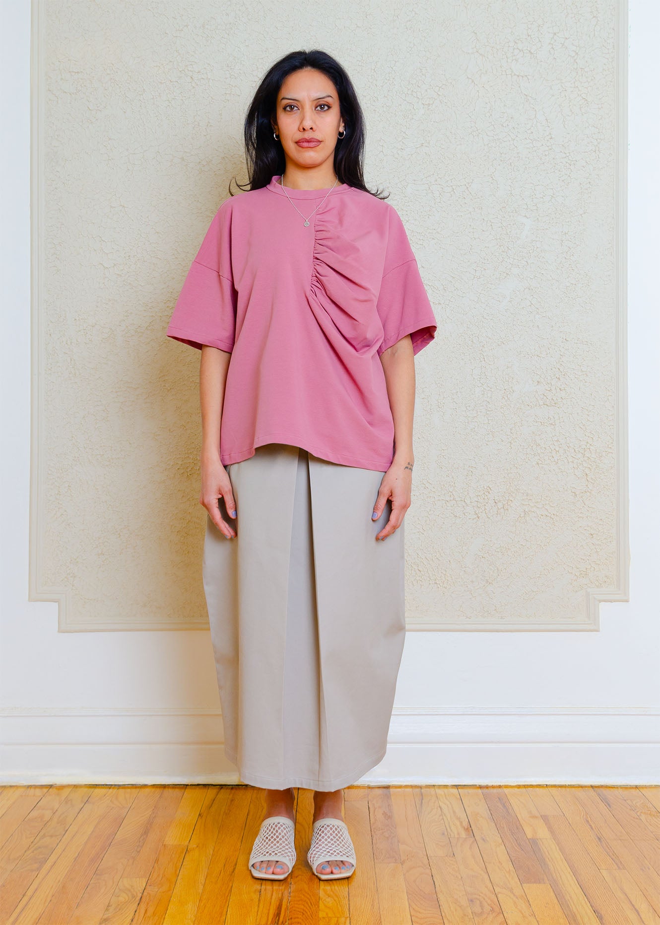 Oversized t-shirt with dropped shoulders and gathering detail.
