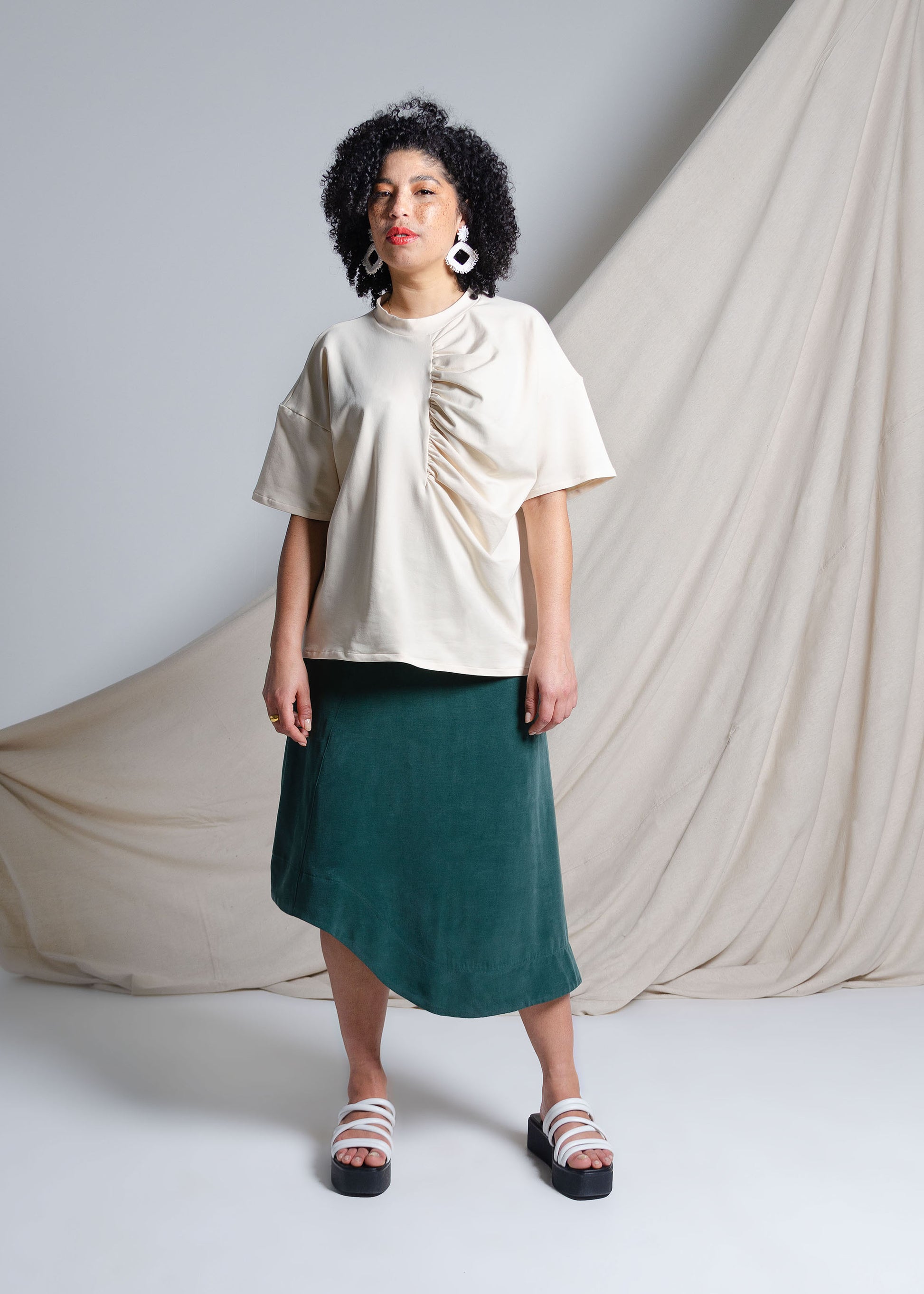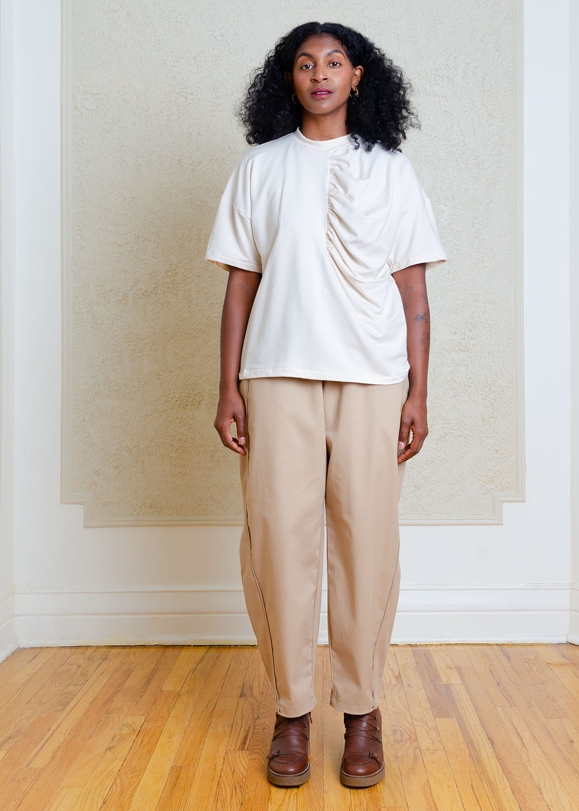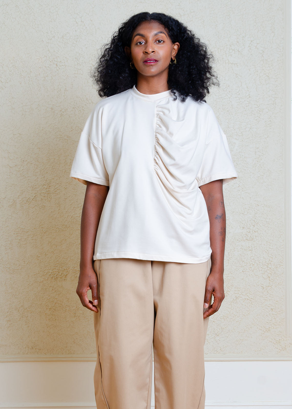 Oversized t-shirt with dropped shoulders and gathering detail.