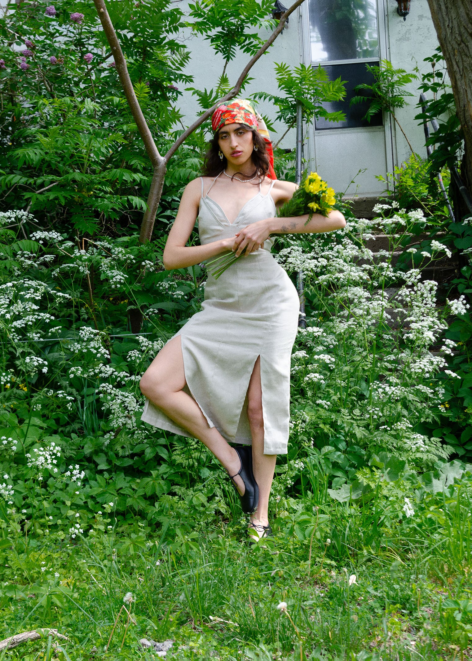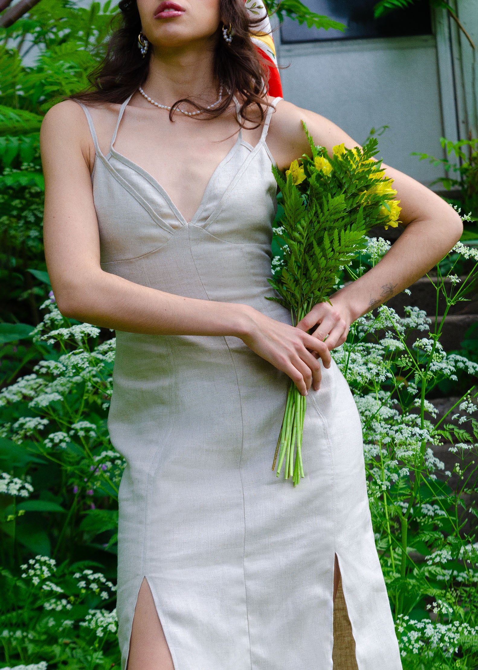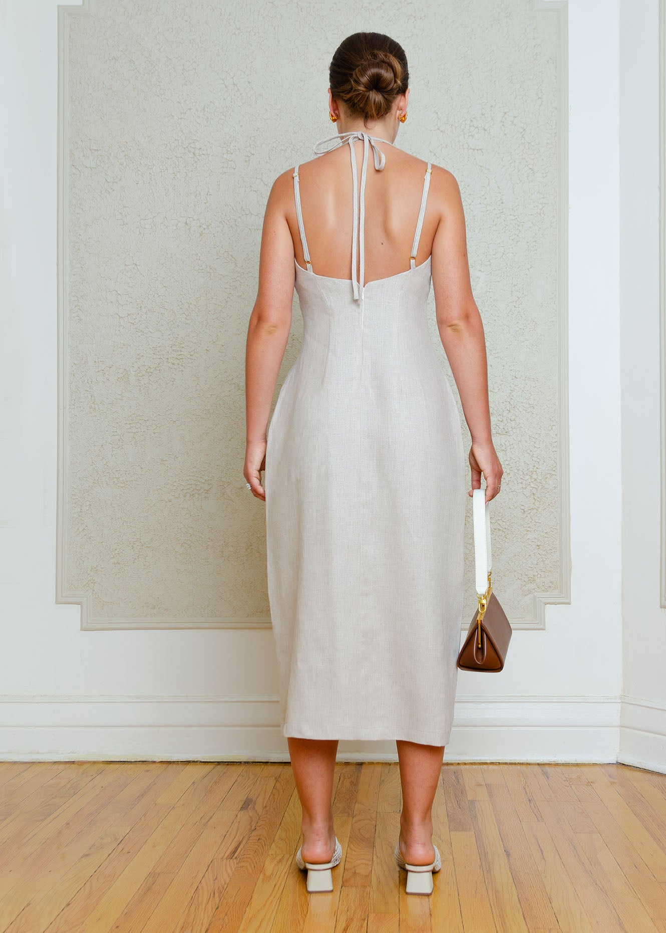 Fitted midi length tank dress with double layer bust and high slits. Center back zip for easy entry and double layer of fabric on the front panels makes for a flattering fit. Low back and halter neck closure. Crisp & breezy 100% undyed linen fabric